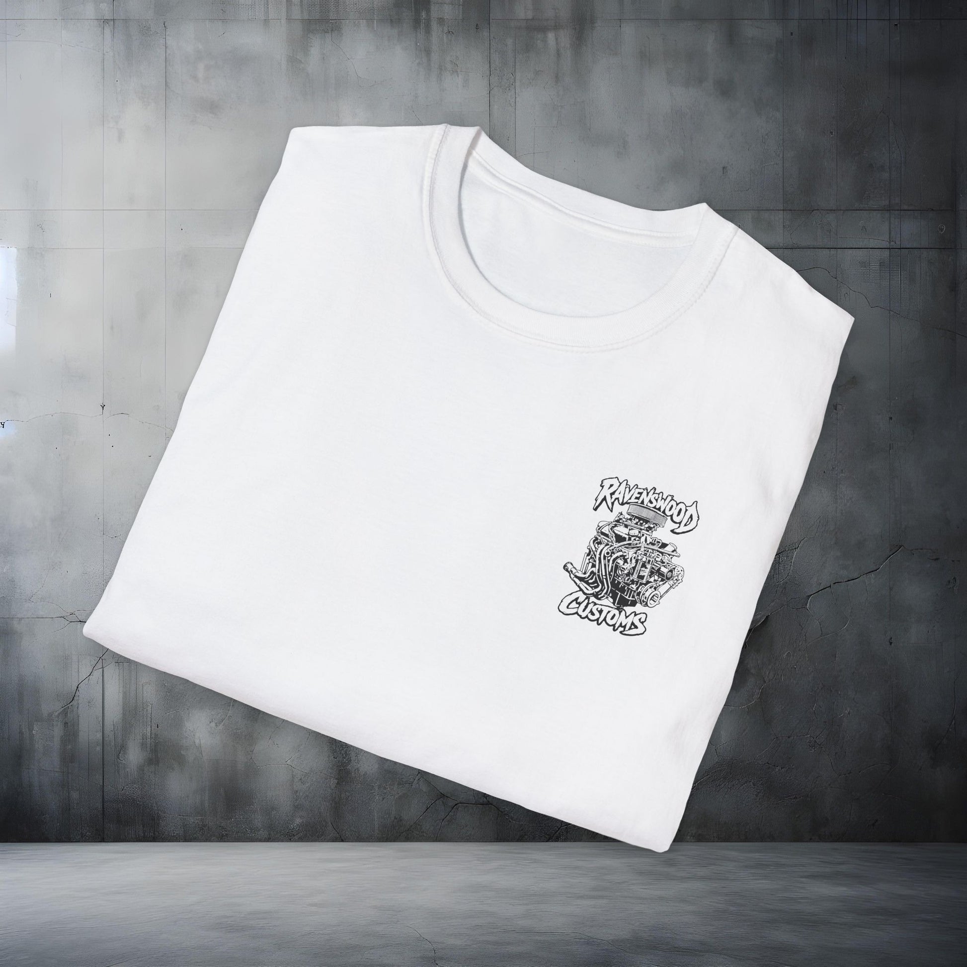 This soft, classic-fit tee carries the look of a small, vintage shop logo on the chest and a bold, high-contrast engine illustration across the back. The black shirt makes the white artwork pop, giving it a lived-in, mechanic’s-shop vibe—like stepping into a garage where something custom is always being built. Wear it while wrenching on a project, rolling to a local car meet, or when you want an easy piece that reads as authentic and handcrafted. The fabric is light and breathable, with a resilient ribbed collar and shoulder taping that hold shape through repeated wear. The printed inner label and sleeves keep the silhouette clean and comfortable against the skin.
