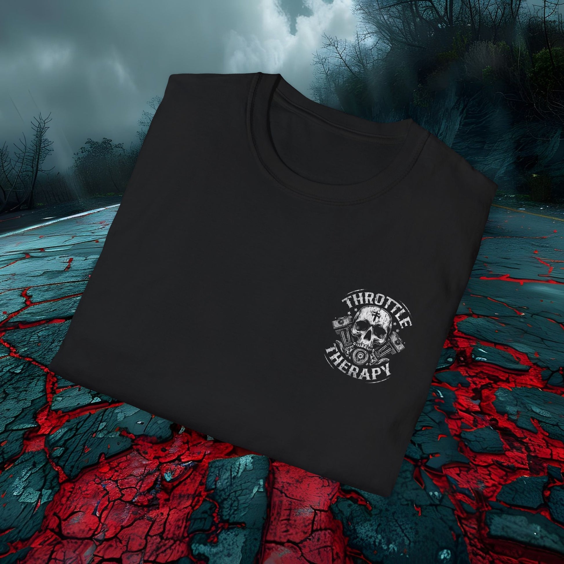 Worn Throttle Therapy Unisex Softstyle T-Shirt - Skull & Motorcycle Design